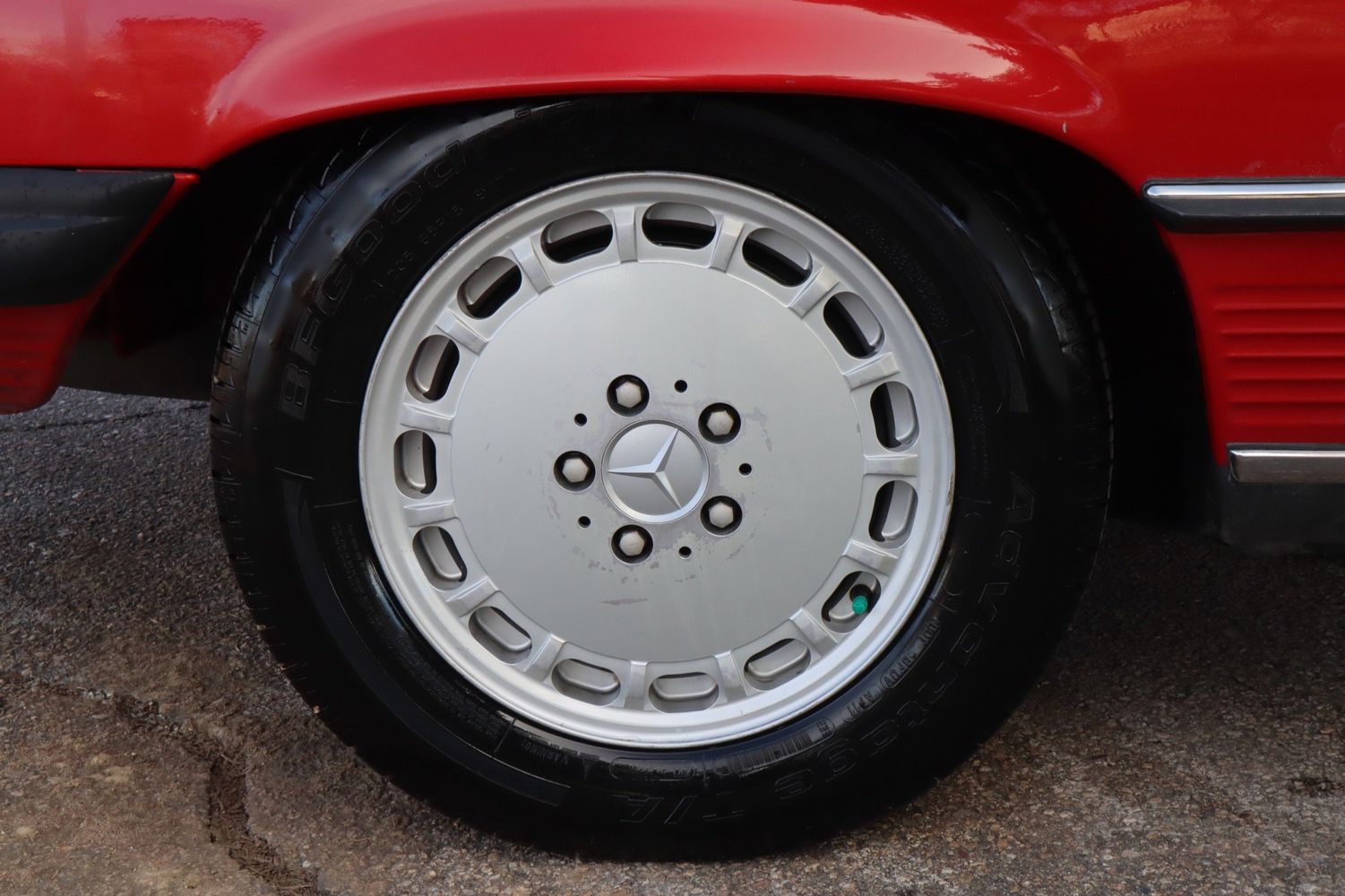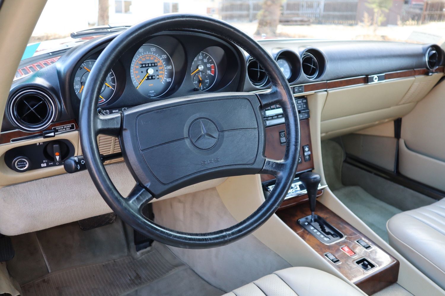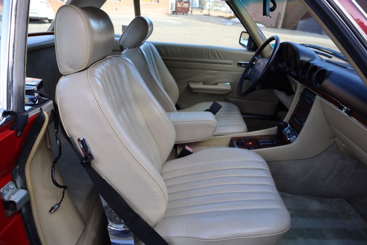 1988 Mercedes-Benz 560SL! The power comes from a 5.0L V8 single overhead cam attached to an automatic transmission supported by RWD. The exterior is finished in red alongside a leather tan interior. Amenities include cruise control, climate control, power windows, and much more!