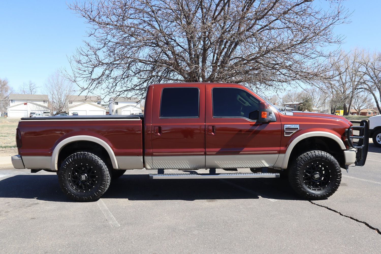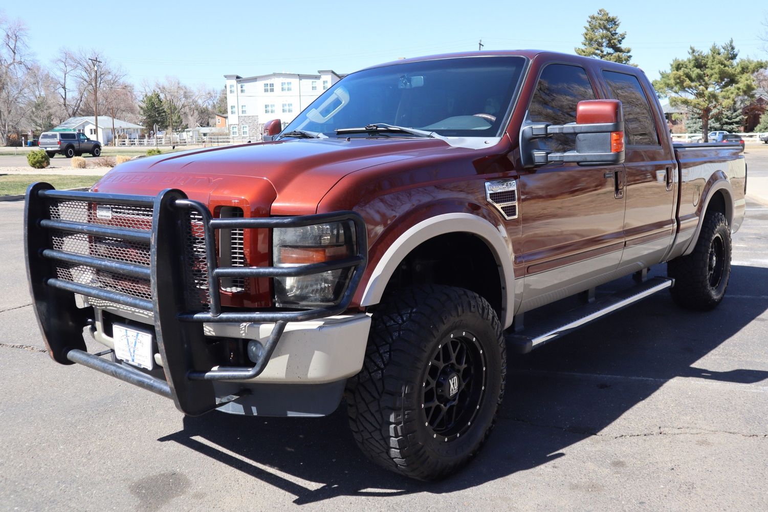 2008 Ford F250 Super Duty that was last owned in Colorado! The power comes from a 6.4L turbo diesel engine attached to an automatic transmissions supported by 4WD. The exterior is finished in dark copper clear coat metallic alongside a leather chaparral brown interior. Amenities include cruise control, climate control, power mirrors, power windows, back up camera, power seats, Ranch Hand grill guard, aftermarket wheels and much more!